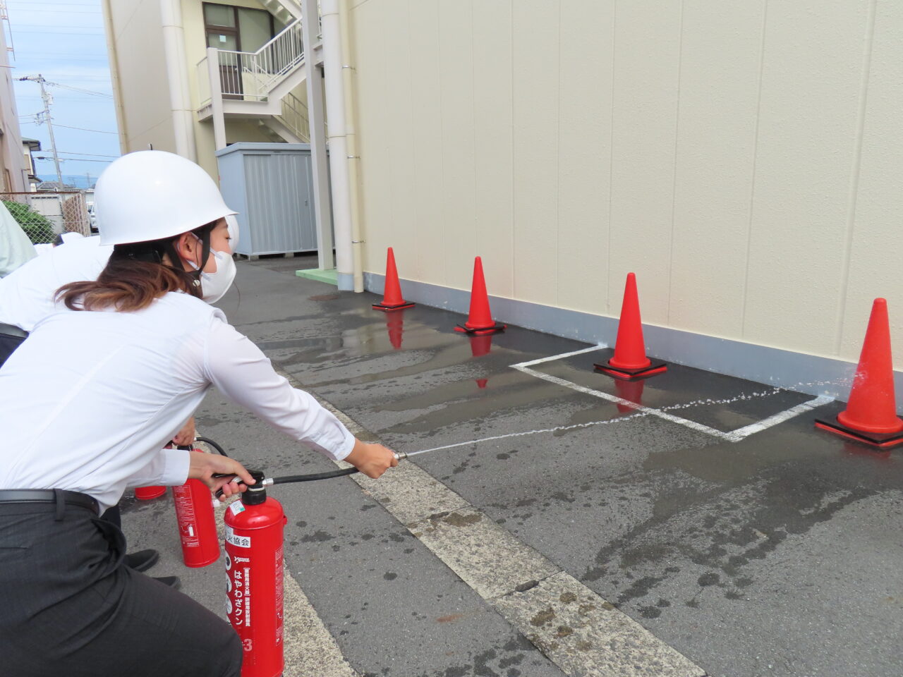 その後、実際に消火器の使い方を学ぶ訓練も行い、初期消火の手順や注意点を実践的に学びました。