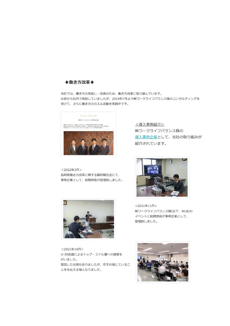 2019年から行ってきた働き方改革への取組(カエル会議)の様子を掲載しています。 また、株式会社ワークライフバランス様のHPにも、導入事例企業として、掲載されています。